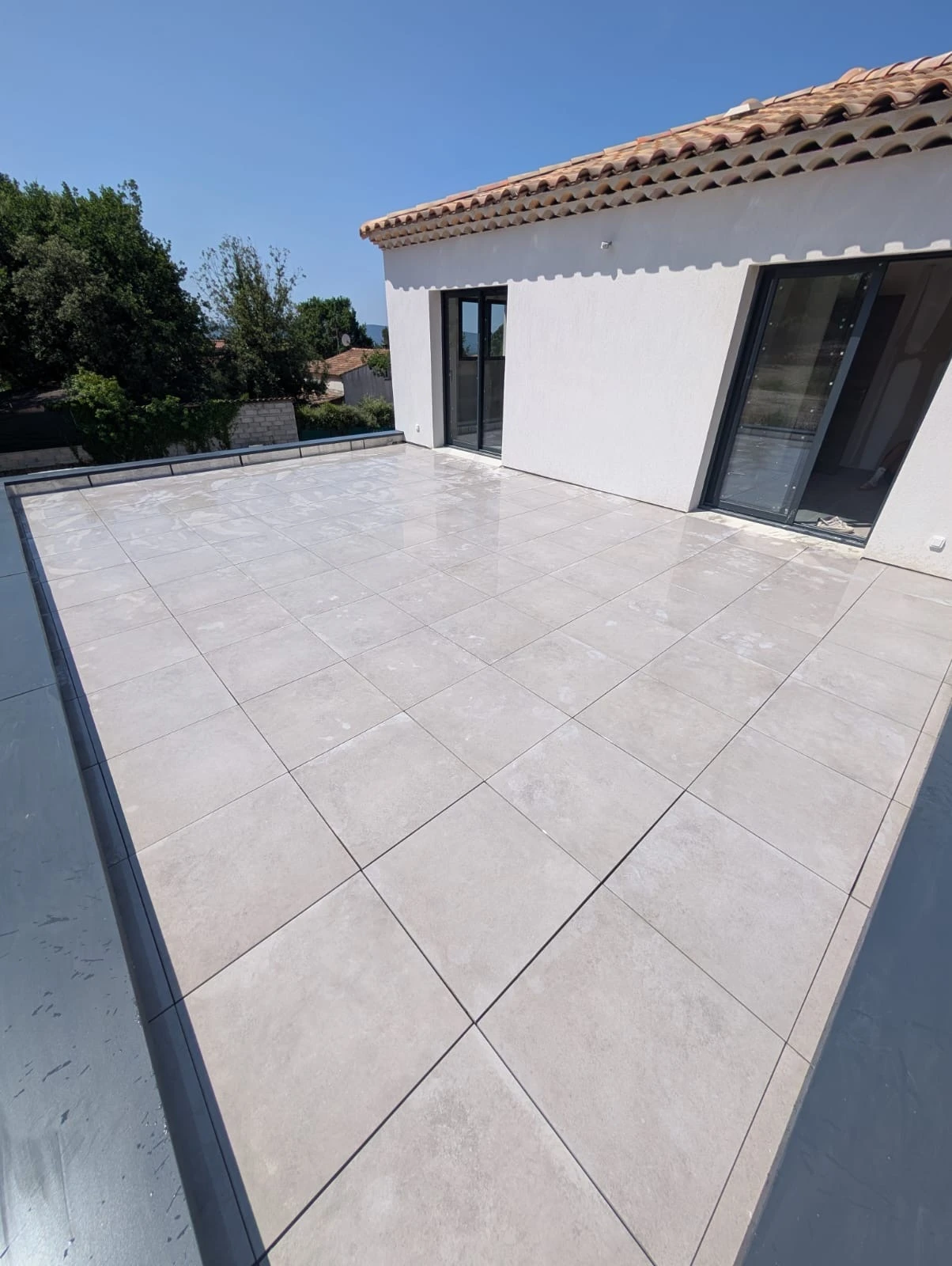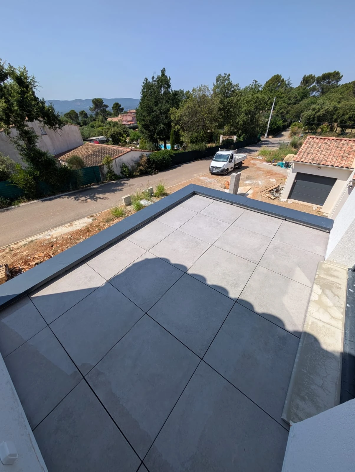 Parmi ses dernières réalisations notables, Hamiache Étanchéité a récemment mené à bien un chantier combinant l’étanchéité d'une surface, la pose de dalles sur plots, ainsi que l'installation de couvertines en aluminium thermolaqué de teinte RAL 7016.
