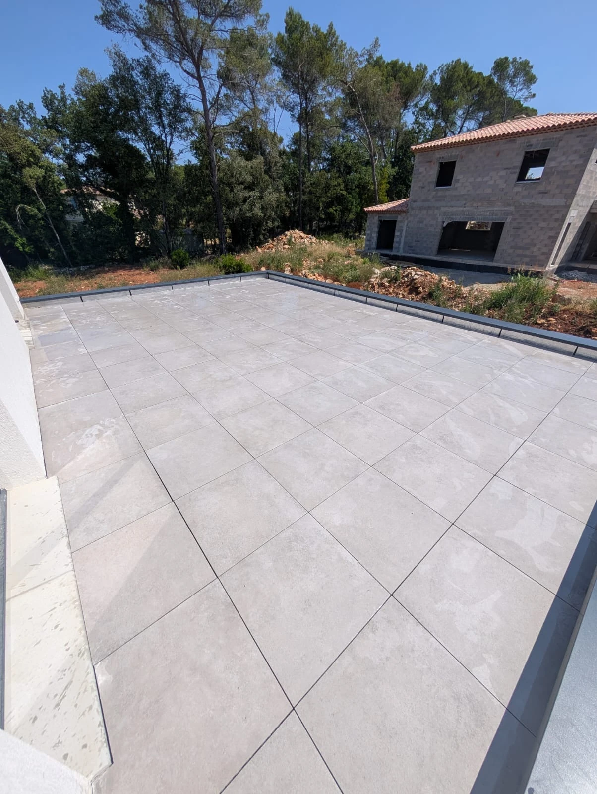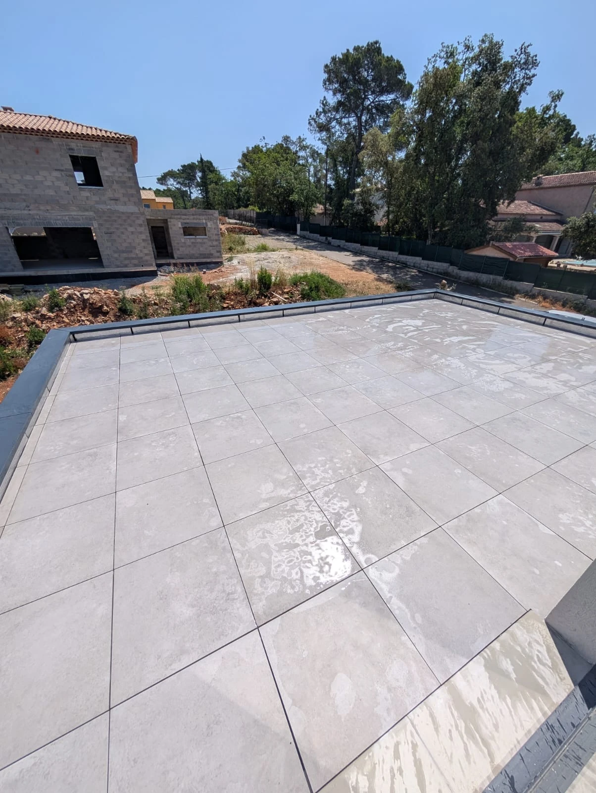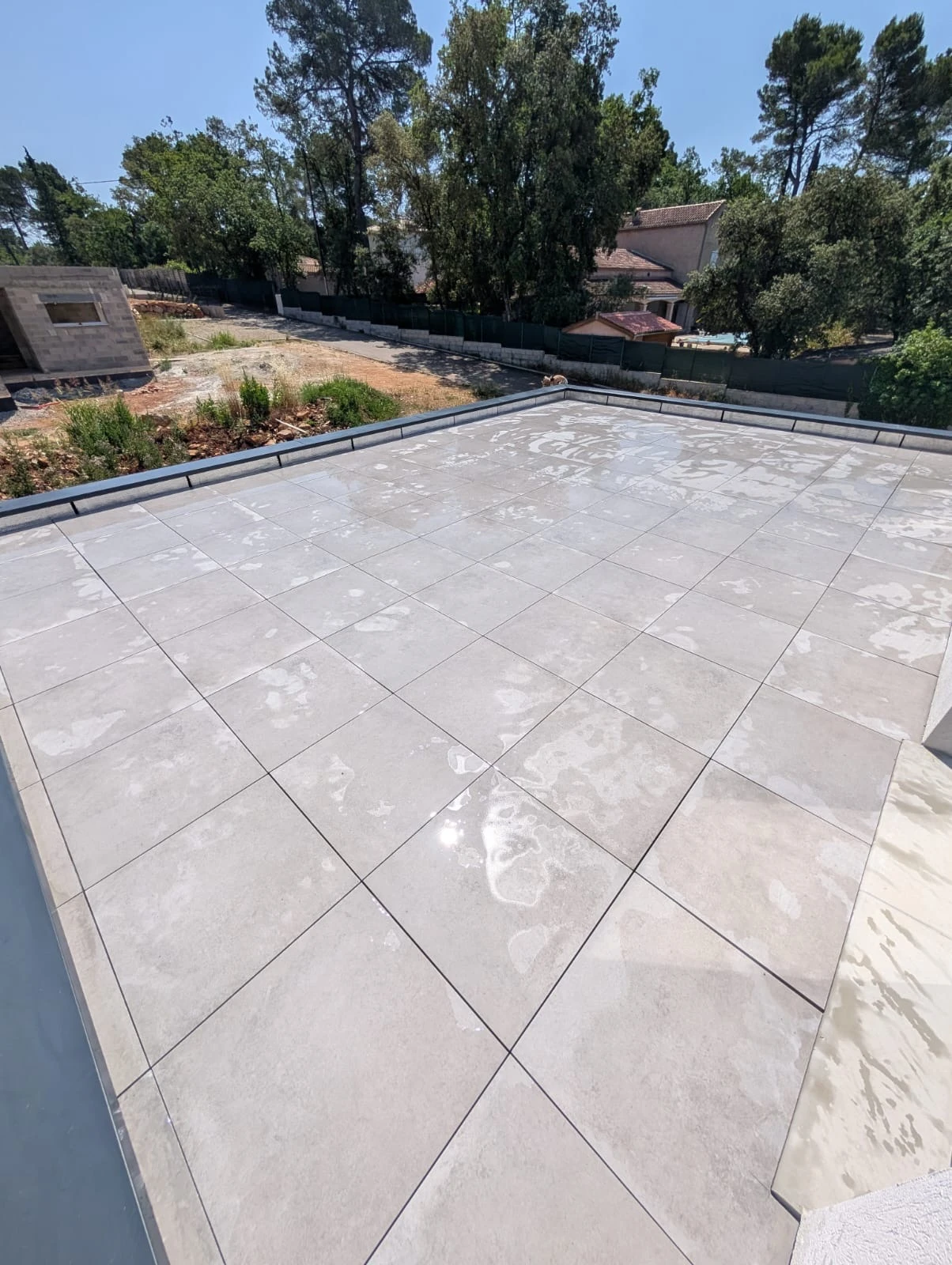 Contrairement à d’autres systèmes de revêtement, la pose de dalles sur plots n’altère pas l’étanchéité. Au contraire, elle la protège mécaniquement tout en permettant un entretien facile. Sur ce projet à Lorgues, après la réalisation de l’étanchéité, les dalles ont été posées avec une grande précision pour assurer une planéité parfaite et une finition haut de gamme.