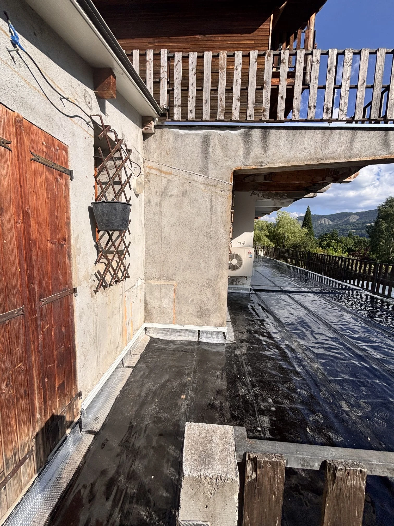 Après la préparation du support, nos techniciens ont appliqué une première puis une seconde couche de Bauder L4, une membrane bitumineuse haut de gamme reconnue pour sa robustesse et sa longévité. Cette double application garantit une protection optimale contre les infiltrations d’eau et les intempéries.