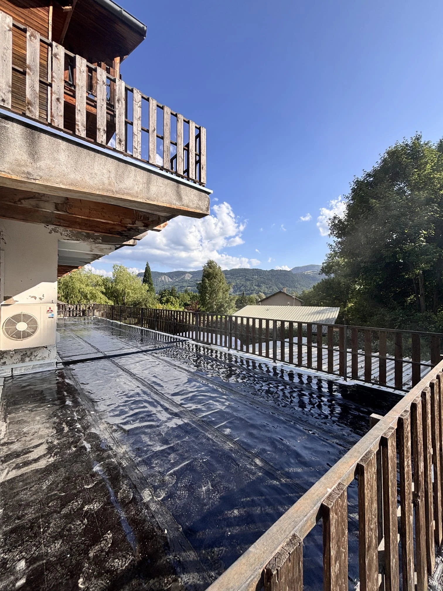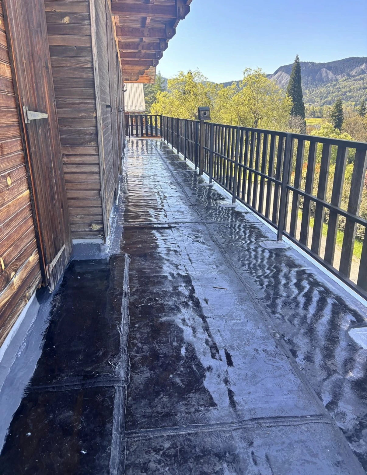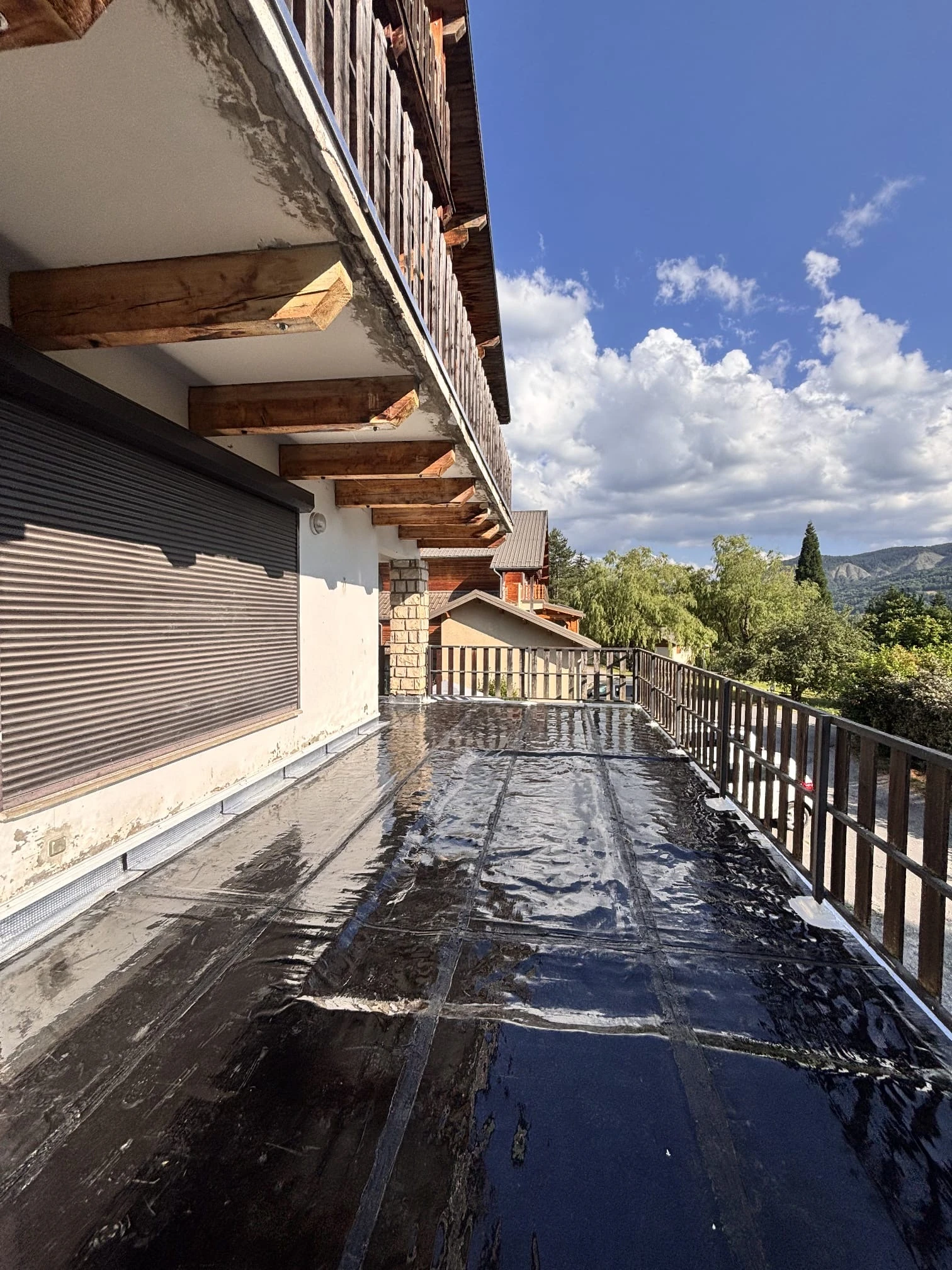Pour une étanchéité parfaite, nos équipes ont réalisé les relevés périphériques sur l’ensemble des bords de la toiture, assurant ainsi une continuité de la membrane. Nous avons également traité l’étanchéité des piliers du garde-corps pour prévenir tout point faible potentiel.